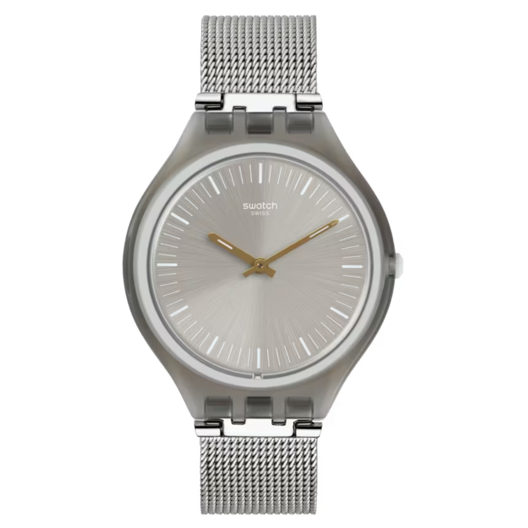 Exhibiting a low-profile ultra-thin Swatch case construction, the warm gray sun-brushed dial features white print and gold-colored hands with white superluminova. The look comes together with an adjustable mesh stainless steel bracelet.